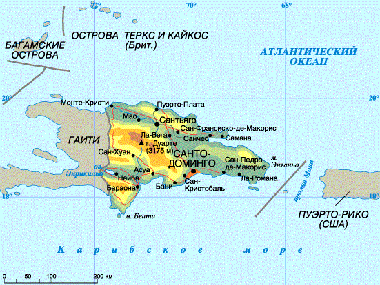 Доминикана на карте мира занимает большую часть острова Гаити. Она омывается величественным Атлантическим океаном и синим Карибским морем. В этом экзотическом раю на сотни километров протянулись белоснежные пляжи, живописные ландшафты, реки, леса и горы. Въезд в эту страну безвизовый, поэтому ежегодно здесь отдыхает огромное количество людей всех возрастных категорий со всего мира.